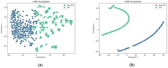 Figure 8a presents a direct mapping of original features from the 400-D ESM-2+AADP-PSSM feature subset before model training. Although there is a discernible trend of separation between ATGs and non-ATGs, a degree of overlap remains. This suggests that the initial features possess inherent limitations in their discriminative power. In contrast, the distribution of final hidden features extracted by the SVM classifier after training, as shown in Figure 8b, reveals distinctly separated clusters for ATGs and non-ATGs in the two-dimensional space. Visualizing the feature distribution before and after the SVM training demonstrates a reduction in category overlap, indicating that our model successfully learns key information during training.
