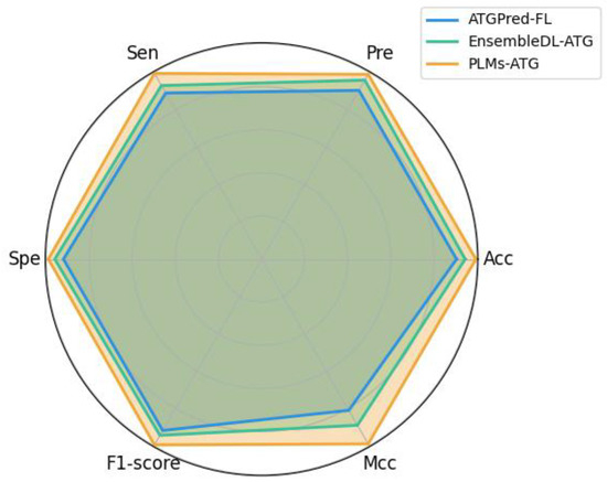 To the best of our knowledge, there are only two computational tools for the identification of ATGs on the same dataset, i.e., ATGPred-FL and EnsembleDL-ATG. As mentioned above, these models relied on a variety of handcrafted features to train machine learning algorithms or deep learning architectures for predicting the ATGs. For a fair comparison with existing methods, we adopted the same training set and independent test set to evaluate the identification performance. The results are visually presented in Figure 9 using the common metrics, including Acc, Pre, Sen, Spe, F1-score, and MCC.