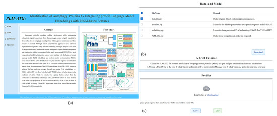 Screenshots of the ATG-PLM web server. (a) The web interface; (b) data download interface; and (c) input data upload and predict interface.