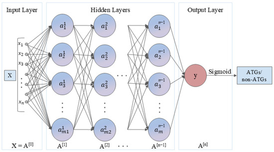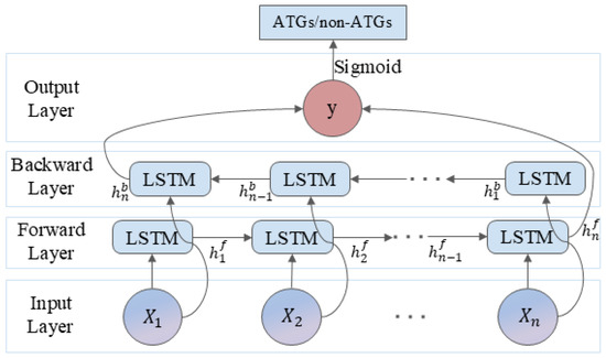 Moreover, two deep learning algorithms were adopted to conduct the identification of ATGs, including a DNN and a BiLSTM network. DNN is a type of artificial neural network with multiple hidden layers between the input and output layers, capable of learning complex patterns and representations from the input features. Considering significant differences in feature dimensions, we developed two DNN architectures: a lightweight two-layer network (15–10 neurons) for 20-D feature sets, and a deeper three-layer structure (350–300–250 neurons) for 400-D and 420-D feature sets. Moreover, ReLU activation functions were used in the hidden layers to introduce non-linearity, while a dropout rate of 0.2 was applied to prevent overfitting. Binary cross-entropy was used as the loss function. The model was trained using the Adam optimizer with a learning rate of 0.001 and a batch size of 8. Figure 11 shows the DNN architecture.