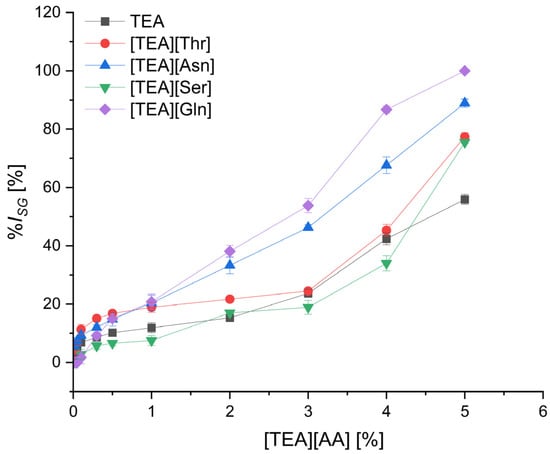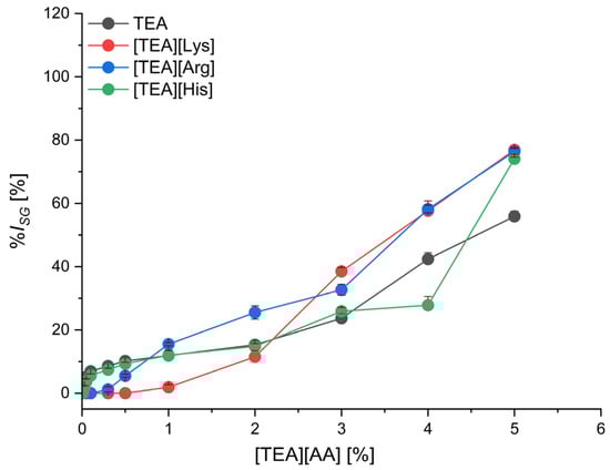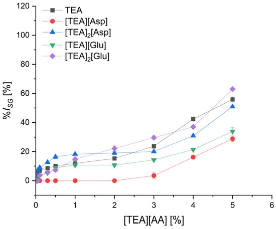 The effect of [TEA][AA] salts concentration in the range from 0.01% to 5.0% on the decrease of the cress seeds germination in comparison to the control containing only water in the substrate was assessed. The dependence of seed germination inhibition (%ISG) on the concentration of the compound is presented in Figure 1, Figure 2, Figure 3 and Figure 4. Data are grouped into four categories based on the type of amino acid—polar (Figure 1), nonpolar (Figure 2), basic (Figure 3), and acidic (Figure 4) in the salt. Data for starting triethanolamine, TEA, are added to each graph.