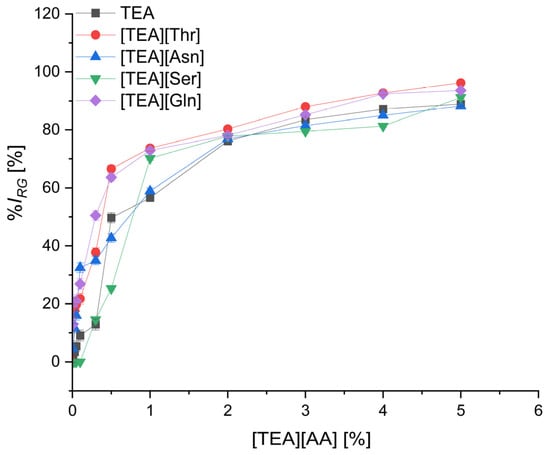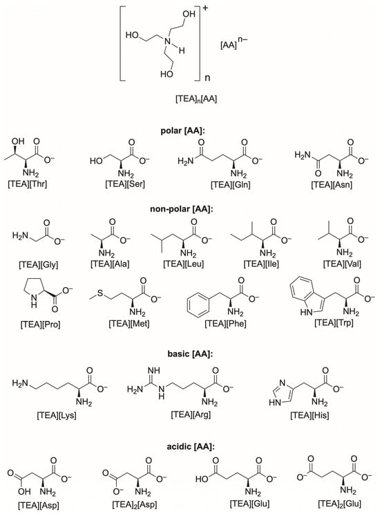 Triethanolammonium salts of amino acids, [TEA][AA], used in the presented studies, were synthesized on our own by the reaction of triethanolammonium hydroxide and the respective amino acid. The synthesis method and identification of [TEA][AA] were described by us in an earlier article [26] and were briefly mentioned in the Supplementary Materials.