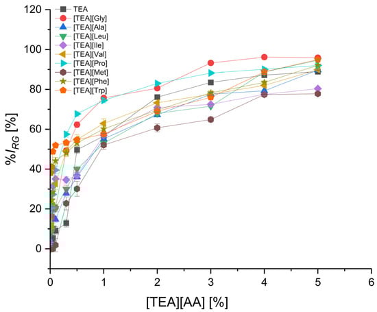 In the group of basic amino acid salts (Figure 3), the seed germination inhibition for each amino acid is similar and comparable with TEA. Lysine salt can be considered the least toxic at concentrations up to 2.0%, as it inhibits seed germination by 11.5%. For concentrations higher than 2.0%, arginine and lysine salts showed the highest phytotoxicity. Germination inhibition at 3.0% concentration was 32.7% and 38.5% for [TEA][Arg] and [TEA][Lys], respectively, and above 76% for both salts used at 5.0% concentration.
