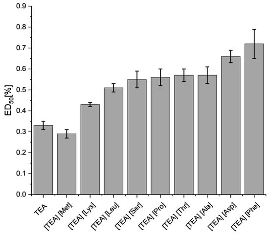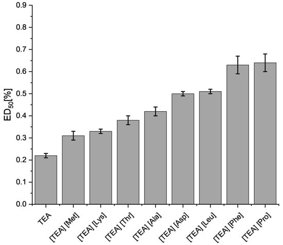 While an increase in cytotoxicity of [TEA][AA] salts on L929 fibroblasts was observed after 48 h of exposure (Figure 10), the ED50 values (with few exceptions) are similar to those after 24 h (Figure 9), which indicates that the majority of the toxic effect was acute. TEA (0.22% ± 0.01) was characterized by the highest cytotoxicity in ED50. Only in the case of [TEA][Met] and [TEA][Pro], the ED50 cytotoxic effect slightly decreased, while in [TEA][Leu] it remained at the same level. A strong toxic effect after 48 h exposure to [TEA][AA] salts, which were ranked in descending toxicity order: