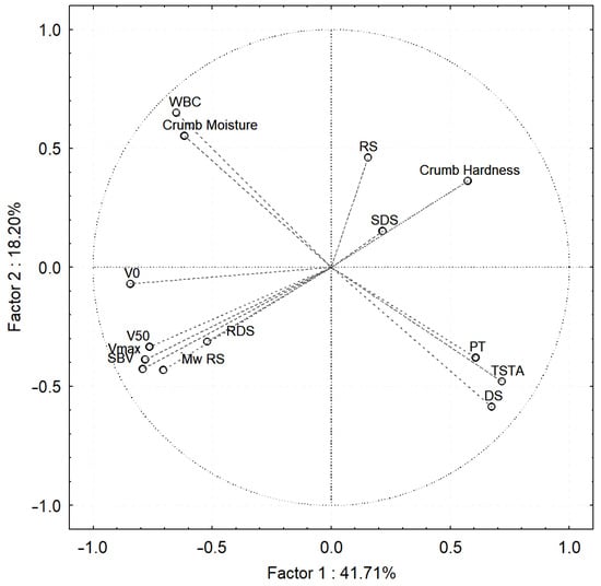 As a result of Principal Component Analysis (PCA, Figure 1), it was found that as crumb hardness increased, RDS contents decreased, while RS contents increased, which can be explained by the more difficult and slower enzymatic hydrolysis of the crumb of breads with high bread crumb hardness. In addition, the crumb with high moisture content had a small amount of very slowly digested starch (DS). The observed correlations were probably related to the different degrees of starch pasting in the crumb of the breads, depending on the water content.
