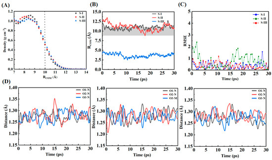 3 radicals and water molecules is systematically analyzed through coordination number measurements across three distinct configurations (S-I, S-II, and S-III) during a 30 ps molecular dynamics simulation. The time series data presented in
