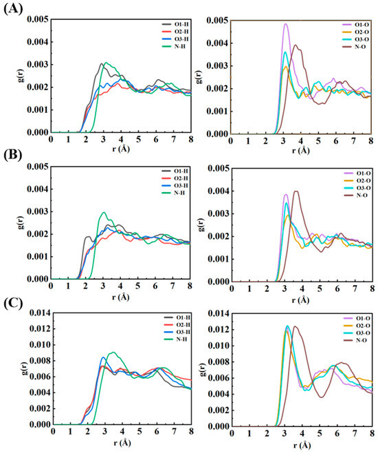 3, which facilitates symmetrical interactions between its three oxygen atoms and surrounding water molecules. Additionally, the symmetry of the RDF peaks across all three oxygen atoms confirms that the planar π-system of NO