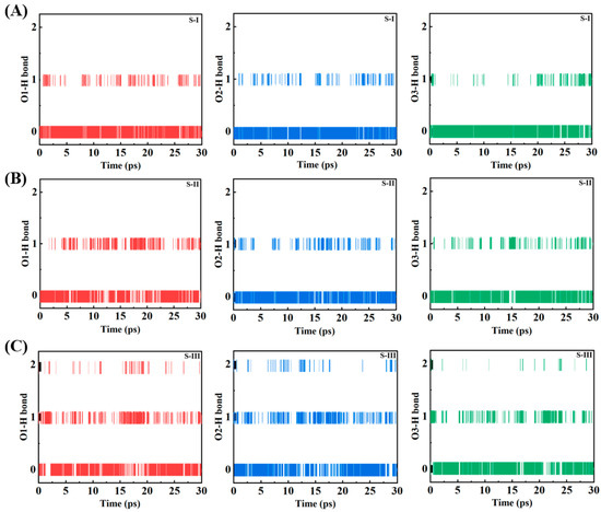 Figure 3A,B), the coordination states exhibit characteristic interfacial dynamics, predominantly oscillating between values of 0 and 1, with infrequent occurrences of double coordination events. The surface-bound species demonstrate pronounced temporal fluctuations in their hydrogen bonding networks, evidenced by rapid transitions between coordination states and extended periods of zero coordination, indicative of limited water accessibility at the interface. All three oxygen atoms manifest analogous hydrogen bonding patterns in the surface configurations, suggesting uniform exposure to the aqueous environment despite their spatial disposition. The bulk-phase configuration (S-III,