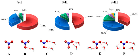 Overall, the RDF analysis highlights the environment-dependent behavior of NO3 radicals. At the air–water interface (S-I and S-II), NO3 forms fewer and weaker hydrogen bonds, resulting in a more dynamic hydration structure. This flexibility promotes the radical’s interactions with gas-phase species, increasing its reactivity at the interface. In contrast, the bulk-phase configuration (S-III) demonstrates stronger and more extensive hydrogen bonding, which stabilizes the hydration shell and reduces the radical’s mobility and reactivity. These results underscore the critical role of hydration structures in modulating the chemical behavior of NO3 radicals. The planar geometry and delocalized π-system of NO3 facilitate symmetrical hydrogen bonding in both interfacial and bulk environments. However, the weaker hydration at the interface likely makes surface-localized NO3 radicals more accessible for interfacial chemical reactions, such as interactions with gas-phase pollutants. In comparison, the stronger and more structured hydration shell in the bulk phase electronically stabilizes NO3, reducing its reactivity and extending its atmospheric lifetime.