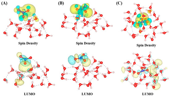 3 radicals across different hydration environments: surface-parallel (A), surface-perpendicular (B), and bulk-phase (C). The isosurface plots for spin density and the LUMO in