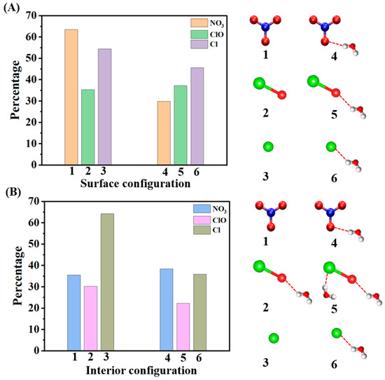 3 demonstrates a dominant non-hydrated configuration (~63%, Configuration 1) due to its planar geometry and delocalized π-system, where the negative charge density preferentially orients toward the bulk water while minimizing surface hydration to reduce surface tension. In contrast, the ClO radical shows a moderate single-water interaction (~35%, Configuration 2), which arises from its strong dipole moment and the electronegative oxygen atom’s ability to form directed hydrogen bonds with surface water molecules. Unlike NO
