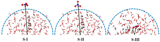 3 radical. While the initial droplet radius was set to 10 Å, the system naturally expanded to approximately 12 Å after equilibration through DFT and AIMD simulations (~3 ps), resulting in a realistic density distribution that captures both bulk-like and interfacial behaviors. These configurations, labeled S-I, S-II, and S-III, represent different spatial and orientational arrangements of the radical, as shown in