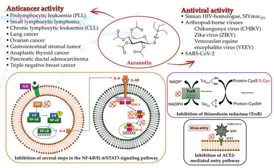 The anticancer activity of auranofin has been suggested to occur through the inhibition of redox enzymes that are essential for maintaining intracellular levels of ROS, interaction with TrxR, ubiquitin–proteasome system (UPS), tyrosine kinases, protein tyrosine phosphatases (PTPs), topoisomerases, and signaling pathways related to cell proliferation, apoptosis, and ferroptosis [72,73,74,75]. The NF-kB/IL-6/STAT3 cascade may also be useful to explain the anticancer activity of auranofin, as NF-kB, IL-6, and STAT3 are central players linking chronic inflammation to cancer by driving tumor initiation and subsequent growth and metastasis.