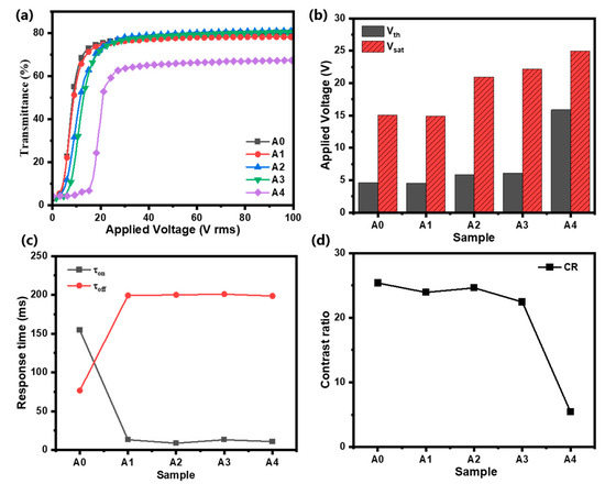 (a) The transmittance curve with voltage; (b) threshold voltage (Vth) and saturation voltage (Vsat); (c) contrast ratio (CR); and (d) rise time (τon) and decay time (τoff) of Samples A0–A4.