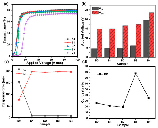 (a) The transmittance curve with voltage; (b) threshold voltage (Vth) and saturation voltage (Vsat); (c) contrast ratio (CR); and (d) rise time (τon) and decay time (τoff) of Samples B0–B4.