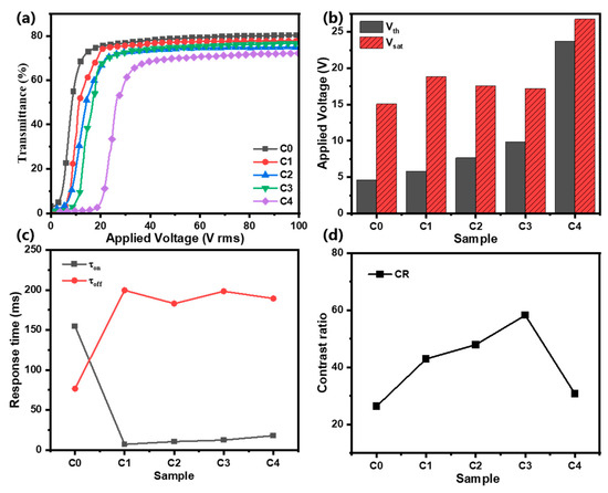 (a) The transmittance curve with voltage; (b) threshold voltage (Vth) and saturation voltage (Vsat); (c) contrast ratio (CR); and (d) rise time (τon) and decay time (τoff) of Samples C0–C4.