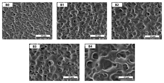 As mentioned above, the electro-optical performance of PDLC films is predominantly influenced by two key factors: the morphological characteristics of the polymer matrix and interfacial interactions between liquid crystal (LC) molecules and the polymer network. On this basis, we characterized the microscopic morphology of the Group B samples, as shown in Figure 5. It can be seen that the dimensions of LC droplets undergo an obvious increase in the porous structure with the content of 20 nm ATO NPs increasing from 0.0% to 0.8%. This is because the nanoparticles hinder the propagation of UV light to a certain extent, and the polymerization rate will decrease at a lower UV light intensity, leading to the occurrence of full phase separation to obtain a larger mesh structure. However, only the polymerization rate is affected, and the effect on the polymerization degree is not great when sufficient polymerization time is guaranteed. In addition, it is evident that ATO NPs are uniformly dispersed in the polymer network at a low doping content, but aggregation occurs as the content of ATO NPs continuously increases. Especially in Sample B4, a large number of ATO nanoparticles can be seen clumping together to form larger particles.
