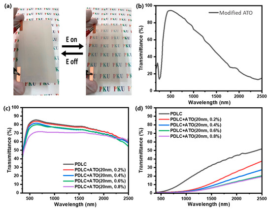 Finally, a 10 cm × 5 cm PDLC film was fabricated to test its near-infrared shielding capability and to demonstrate its potential application in the field of smart displays, as shown in Figure 6. Figure 6a shows that the PDLC sample is sandwiched between two flexible conductive substrates, which can switch between scattering and transparent states under the action of an electric field. The Vis-NIR transmittance spectra of the 1 wt% 20 nm modified ATO nanoparticle ethanol solution from 400 nm to 2500 nm are shown in Figure 6a, which confirms that ATO has very good visible light transmittance and infrared shielding capability. The Vis-NIR transmittance spectra of PDLC film with different doping contents of modified ATO (0%, 0.2%, 0.4%, 0.6%, 0.8%) in the on state and off state of PDLC from 400 nm to 2500 nm are shown in Figure 6c and Figure 6d, respectively. It can be seen that whether in the on state or off state, the introduction of ATO significantly reduces the transmittance of infrared light. When the ATO doping amount exceeds 0.6%, a continuous increase in the doping amount no longer has an obvious infrared shielding effect. However, the visible light transmittance of the sample film is significantly affected, and the transmittance of both on and off states decreases significantly. Therefore, PDLC film with 0.6% modified ATO has optimal overall performance.