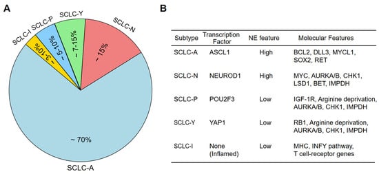Importantly, recent advancements in genomic, transcriptomic, and proteomic analyses have revealed that SCLC consists of distinct molecular subtypes that drive tumor progression and therapeutic responses [16,17,18,20]. This has led to a transcription factor-based classification, identifying four core SCLC subtypes based on the expression of lineage-defining transcription factors (TFs): ASCL1 (SCLC-A), NEUROD1 (SCLC-N), POU2F3 (SCLC-P), and YAP1 (SCLC-Y) [14] (Figure 1A,B). ASCL1 and NEUROD1 define the majority of neuroendocrine-high (NE-high) SCLCs, while YAP1 and POU2F3 mark the non-neuroendocrine (NE-low) subtypes. More recently, multi-omic studies and non-negative matrix factorization (NMF) analyses have identified additional subtypes, including the SCLC-Inflamed (SCLC-I) phenotype, which exhibits immune-related gene expression, as well as new classifications integrating DNA repair, metabolic, and epigenetic dependencies [17,18,21].