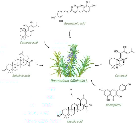 The biological activities of Rosmarinus officinalis L. have been associated with the presence of pharmacologically active constituents belonging to phenolic diterpenes and triterpenes; phenolic acids; and flavonoids such as carnosic acid, carnosol, rosmarinic acid, betulinic acid, ursolic acid, and kaempferol (Figure 1) [2,7,14]. Thus, rosemary represents an exceptionally rich source of bioactive compounds [11,13,14,15].