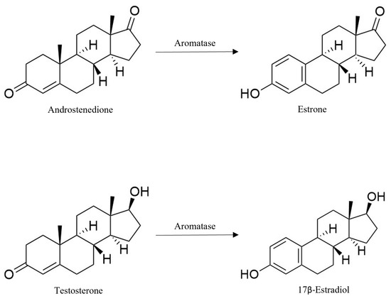 In detail, aromatase with high specificity converts androstenedione and testosterone into estrone (E1) and 17β-estradiol (E2), respectively, through the aromatization of the A-ring (Figure 2). Moreover, other androgens with the same backbone, such as the ones with 15α/16α hydroxylation, are also aromatized by this enzyme [36,37,38].