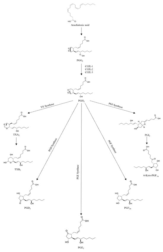 COX-2, or prostaglandin endoperoxide synthase-2 (PGES-2), is a membrane-bound heme-containing glycoprotein, inducible isoform, that catalyzes the initial step of arachidonic acid’s metabolic transformation into prostanoids (Figure 4) [45,46].
