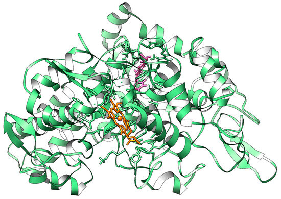 Three-dimensional representation of COX-2 in complex with Rofecoxib. The enzyme is depicted as a green cartoon; the heme group, Rofecoxib, and key residues are represented as orange, pink, and green carbon sticks, respectively. Atomic coordinates were obtained from PDB model 5KIR [47]; the figure was built using the Chimera 1.18 software [41].