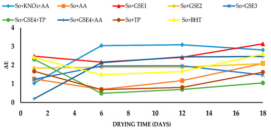 The total color difference (ΔE) value was used to describe the change in the color values of samples, in which the higher ΔE value, the greater difference between two measured samples. There was an interaction (p < 0.05) among antioxidant addition and drying period for ΔE values (Figure 1). The control samples showed a rapid decrease in redness compared to samples with antioxidants, due to browning during the drying period. These results led to an increase in ΔE values for samples with antioxidants over time. The increased ΔE value depends on the type of antioxidant. Figure 1 shows that the values of ΔE for all samples differed already on day 1. The reason for this is the different components added to the So sample, some of which led to a slight change in the color of the minced meat, such as GSE, AA, TP. By the sixth day of drying, the values of ΔE for most samples changed significantly, with the exception of the following samples: So with GSE2, So with GSE3, and So with GSE1. After the sixth day until the end of drying, the values of ΔE for some of the samples—So with GSE2, So with GSE4 and AA, So with KNO3 and AA, and So with GSE3—remained unchanged. It is obvious that the best color retention was observed for these samples. For the remaining samples, there was a gradual increase in ΔE from the sixth day to the end of drying, which indicates the presence of color change in these samples.