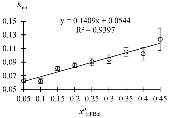 According to the Table 4 data for the investigated range of conditions, the esterification process of AAc and HFBol is characterized by a negative heat effect ( > 0). In general, the heat effect of the esterification process depends on the individual component’s properties and on the unique system properties as a whole. So, the process can be either endothermic [13] or exothermic [14]. It should be considered that the total heat effect of the esterification process of AAc and HFBol, in addition to the heat effect of the reaction itself, includes the hydrophobic effects of HFBol [15] and HFBAc as well as hydration of sulfuric and acetic acids due to the water formation in the system.
