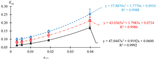 Dependence of the equilibrium constant on the catalyst concentration at atmospheric pressure, initial molar ratio AAc/HFBol = 65/35 T = 30, 50 and 70 °C calculated from Table S2 data.