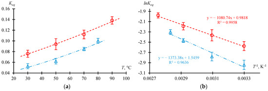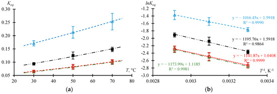 The dependence of the on temperature T is described by the Van’t Hoff equation (Equation (16)). The dependence indicates the standard enthalpy and standard entropy of the reaction.