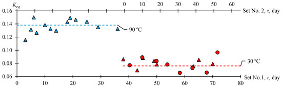 To confirm the obtained data, an additional experiment with two parallel sets was run (Figure 5). Sample 1 was thermostated at 90 °C for 36 days, after which the temperature was reduced to 30 °C and the sample continued to be thermostated for a further 34 days (70 days in total). Set 2 was thermostated at 30 °C for 52 days. From the data in Figure 5, it follows that decreases as the temperature decreases or, vice versa, increases as the temperature increases, and the period of temperature conditioning of samples is sufficient to reach chemical equilibrium.