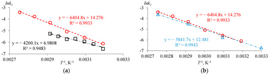 For the second-order reaction, the dependence ) from Equation (19) is linear, and the slope of the line is equal to the rate constant of the forward reaction . The dependence of the rate constant on temperature T is given by the Arrhenius equation:
