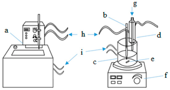 Equipment for researching the kinetics of a chemical reaction. a—thermostat, b—mercury thermometer, c—laboratory reactor with jacket, d—condenser, e—stirrer bar, f—magnetic stirrer, g—sample collection, h—cooling medium, i—heat-carrying medium.
