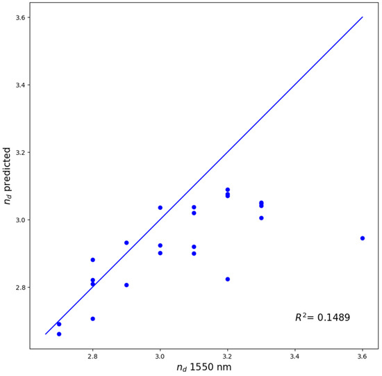 For ChGs, the refractive index was previously studied among other mechanical, electrical, and thermal properties. Mastelini et al. [6] collected data from the SciGlass database, while Singla et al. [7] incorporated the INTERGLAD database. Their coefficients of determination () at testing were 0.87 [6] and 0.916 [7], respectively. These studies employed common machine learning algorithms on datasets where the features represented the chemical composition in atomic percents and included a Shapley additive explanations (SHAP) feature interpretation to reveal their interactions and contributions to the property’s value.