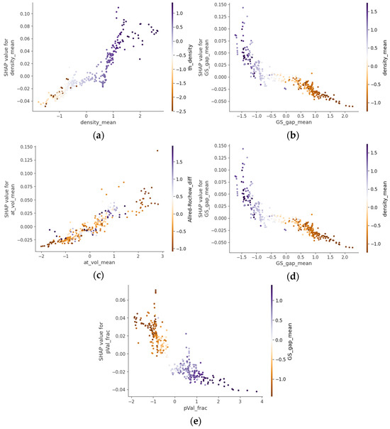 Figure 3 presents selected SHAP dependence plots from the CatBoostRegressor analysis, emphasizing the structural and electronic characteristics most influential for the refractive index in chalcogenide glasses. The values of the features lie on the x-axis, and the Shapley values are on the y-axis. On the right side of the plots, an interacting feature is represented with the color code for its magnitude. Figure 3a demonstrates that increasing the mean elemental density significantly enhances refractive index, aligning with the Lenz–Lorentz relation (n2 − 1)/(n2 + 2) = (4π/3)NARmρ, where ρ is the density, Rm is the molecule polarizability, and NA is the Avogadro number [13]. Experimental data from the Ge-Sb-Se and Ge-Sb-S-Se-Te systems with compositions with heavier elements showed elevated refractive indices due to increased density [14,15]. This correlation was further validated in Ge-As-Se and Ge-Sb-Se glasses, where density increased and refractive index increased proportionally with higher As and Sb contents [16,17].