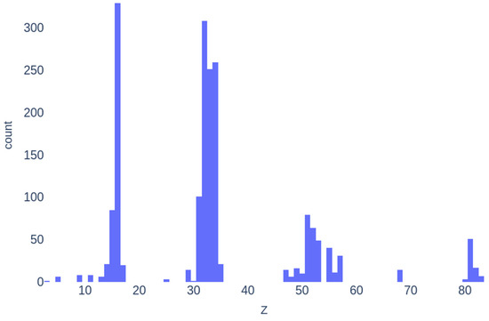 The frequency of elemental representation in the dataset compositions is shown in Figure 5. S is the most abundant element, appearing in more than 320 samples. Ge is the second most represented, with 308 entries, followed by Se and As. Zn and Li appear only once. Consequently, machine learning models are expected to generalize better for compositions containing elements that are more frequently represented in the dataset.