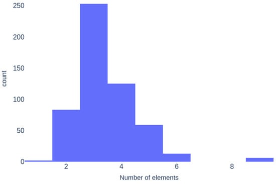 Figure 6 illustrates that ternary glasses are the most common in the dataset, followed by quaternary and binary glasses. Six samples contain nine elements, while two are monoelemental (S and Se glasses).