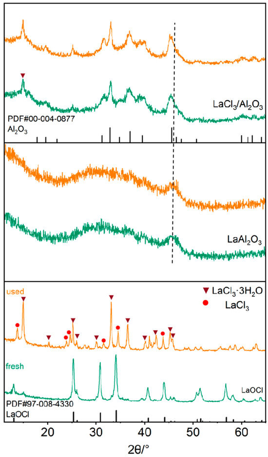 XRD analysis was employed first to investigate the structural evolution of three La-based catalysts before and after C2H6 chlorination. As shown in Figure 1, the fresh LaOCl catalyst exhibited diffraction peaks matching the tetragonal LaOCl reference (ICCD 08-4330) [39]. After reaction, however, the LaOCl peaks significantly diminished, accompanied by the emergence of LaCl3 (ICCD 02-3146) and LaCl3·3H2O phases (ICCD 07-5266), indicating irreversible chlorination and lattice collapse under Cl2-rich conditions. In contrast, the LaAl2O3 catalyst demonstrated exceptional structural stability, with nearly identical XRD patterns before and after reaction. Its diffraction peak exclusively displayed Al2O3 peaks (ICCD 04-0877) with no detectable lanthanum oxide phases, suggesting uniform La incorporation into the alumina lattice. This hypothesis is further supported by a distinct shift of the Al2O3 (45°) peak to 46°—a consequence of lattice distortion induced by La doping [40,41]. Notably, the robust La-O-Al bonds formed during high-temperature calcination (900 °C) effectively stabilized La species, preventing LaCl3 formation even after 12 h of exposure to reactive atmospheres at 260 °C. For LaCl3/Al2O3, XRD patterns revealed Al2O3 (ICCD 04-0877) and LaCl3·3H2O (ICCD 07-5266) phases, signifying surface aggregation of LaCl3 due to its high loading.