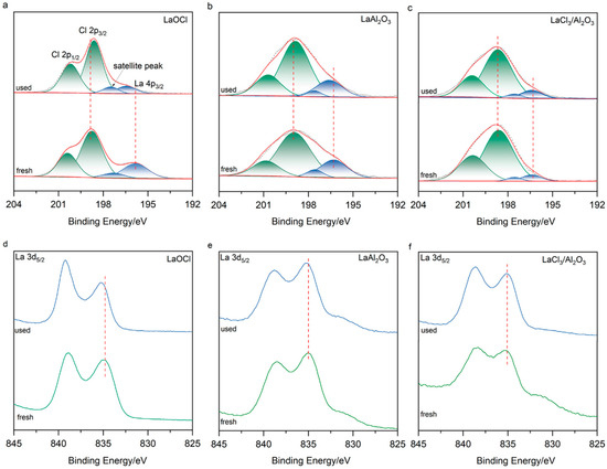XPS was conducted to elucidate the evolution of surface electronic states in LaOCl, LaAl2O3, and LaCl3/Al2O3 catalysts before and after reaction. As shown in Figure 3a–c, the Cl 2p spectra (193–203 eV) were deconvoluted into four characteristic peaks: spin-orbit splitting peaks of Cl− species at 198.8 eV (Cl 2p1/2) and 200.4 eV (Cl 2p3/2), along with the La 4p3/2 peak at 195.8 eV and its satellite peak at 197.5 eV [42,43]. Systematic analysis of binding energy shifts and peak area ratios revealed distinct chlorination mechanisms. For the spent LaOCl catalyst (Figure 3a), the Cl 2p peaks shifted to lower binding energies (Δ ≈ 0.2 eV), while the La 4p3/2 and La 3d5/2 peaks shifted to higher binding energies (Δ ≈ 0.6 eV; Figure 3d). This confirmed electron transfer from La to Cl. A significant increase in the Cl 2p/La 4p3/2 peak area ratio further indicated surface over-chlorination. These observations suggest that continuous Cl coordination at La sites reduces the electron density of La centers, rationalizing the La 4p3/2 upshift. In contrast, the LaAl2O3 catalyst exhibited exceptional stability (Figure 3b,e). Its Cl 2p, La 4p3/2, and La 3d peaks showed minimal shifts (Δ ≤ 0.2 eV), and the Cl 2p/La 4p3/2 peak area ratio remained unchanged after reaction. This demonstrates that robust La-O-Al bonds stabilize surface La species in a LaOClx configuration, preventing excessive chlorination under harsh conditions. Notably, LaCl3/Al2O3 showed invariant peak positions and Cl 2p/La 4p3/2 peak area ratios (Figure 3c,f), confirming structural integrity without significant surface reconstruction.