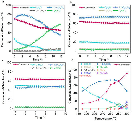 The product selectivity X (x = C2H4, C2H5Cl, C2H3Cl, 1,2-C2H4Cl2, 1,1-C2H4Cl2, and 1,1,2-C2H3Cl3 selectivity) was calculated according to the following equation,