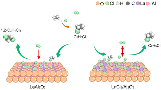 Kinetic studies revealed near-first-order dependence on C2H5Cl for both catalysts (1.06 vs. 0.99, Figure 6b). Combined with the TPD characterization, it is evident that the reaction rate was not influenced by the strength of C2H5Cl adsorption. Worth noting is the significant difference in the reaction orders of Cl2 between the two catalysts. As shown in Figure 6c, the reaction order for Cl2 was 0.29 for LaAl2O3 and 0.69 for LaCl3/Al2O3, indicating that LaAl2O3 promotes Cl2 adsorption and activation. Combining the kinetic data with the catalytic performance, it can be conclusively inferred that the LaAl2O3 catalyst possessed more efficient chlorine adsorption sites, significantly accelerating the surface chlorination process. Notably, when the LaCl3 species on the catalyst surface was overly aggregated, this structural advantage was compromised, leading to the active sites being covered and the efficiency of chlorine activation being reduced. As shown in Figure 6d, the apparent activation energy for LaAl2O3 was 54.1 kJ·mol−1, significantly lower than the 85.7 kJ·mol−1 observed for the LaCl3/Al2O3 catalyst. This dynamic parameter difference was highly consistent with the catalytic performance evaluation and reaction order measurements.