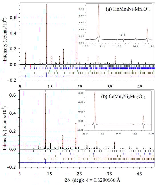 All prepared RMn3Ni2Mn2O12 samples with R = Bi, Ce, and Ho had a cubic crystal structure, as all reflections belonging to RMn3Ni2Mn2O12 could be indexed in a cubic system. The samples also contained different impurities depending on R: the R = Bi sample had Bi2O2CO3, NiO, NiMnO3, and GdFeO3-type impurities, the R = Ce had CeO2, NiO, and NiMnO3 impurities, and the R = Ho sample had HoMn2O5, NiO, and NiMnO3 impurities. All cubic reflections of the R = Bi and Ce samples could be indexed in space group Im-3, which is the parent (maximum) symmetry of the AA′3B4O12-type perovskites [7,8,9,10,11]. On the other hand, a (311) reflection was observed in the synchrotron XRPD data of the R = Ho sample (the inset of Figure 1a). This reflection is forbidden in space group Im-3, and suggests space group Pn-3, which is observed in cases of full or partial B site ordering of AA′3B2B′2O12-type perovskites [12,14,15,16,17,18,19].