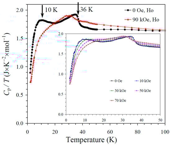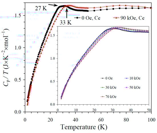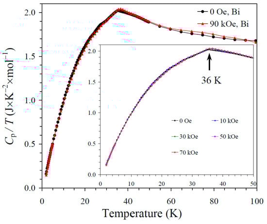 The specific heat, Cp, was measured on cooling from 100 K to 2 K at different magnetic fields up to 90 kOe by a pulse relaxation method, using a commercial calorimeter (Quantum Design PPMS, San Diego, CA, USA). All magnetic and specific heat measurements were performed using pieces of dense pellets.