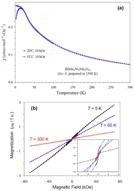 The temperature dependence of the magnetic susceptibility of BiMn3Ni2Mn2O12 is shown in Figure 5a, and Figure 5b gives an M versus H curve at 5 K, 60 K, and 300 K. The divergence between the ZFC and FCC curves was observed below about 15 K at H = 10 kOe; at the same temperature, a broad maximum was observed on the ZFC curve. However, no clear anomalies were detected near 36 K, even on differential curves. Therefore, only specific heat data could clearly identify a magnetic phase transition temperature in BiMn3Ni2Mn2O12. The M versus H curves showed a very weak step-like hysteresis near the origin. The hysteresis near the origin probably originated from a small amount of ferrimagnetic NiMnO3 impurity (with TC = 430 K [66]) with soft ferrimagnetic properties, as the hysteresis was observed even at 300 K. A slim extended hysteresis observed at 5 K (the inset of Figure 5b) originated from BiMn3Ni2Mn2O12.