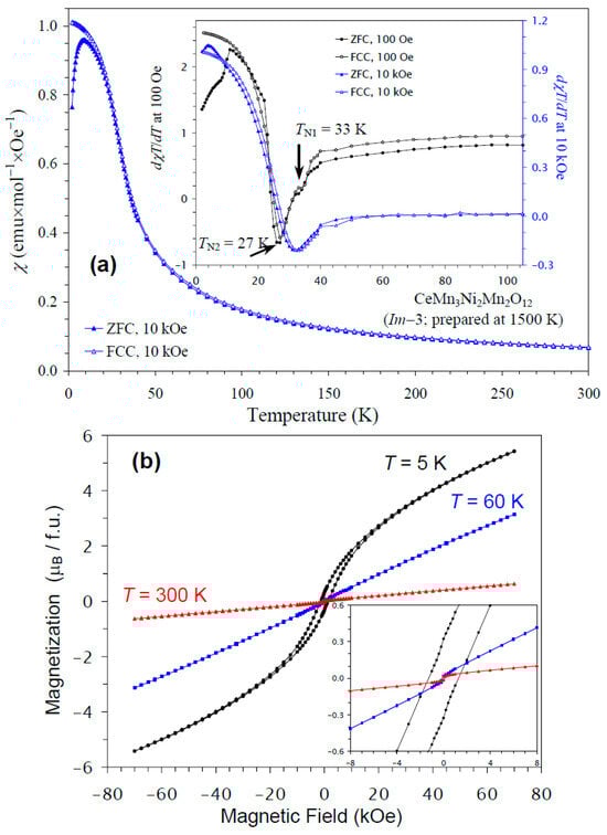 The temperature dependence of the magnetic susceptibility of CeMn3Ni2Mn2O12 is shown in Figure 6a, and Figure 6b gives an M versus H curve at 5 K, 60 K, and 300 K. The divergence between the ZFC and FCC curves was observed below about 10 K at H = 10 kOe; at nearly the same temperature, a broad maximum was observed on the ZFC curve. The differential curves showed some anomalies; for example, the dχT/dT versus T curves at H = 100 Oe showed peaks at 27 K with shoulders at 33 K, in agreement with the specific heat data; on the other hand, at H = 10 kOe, only one broad anomaly was seen at 33 K. The M versus H curve at 5 K demonstrated a slim extended hysteresis. Above TN (at 60 K and 300 K), a very weak, step-like hysteresis was observed near the origin, originating from ferrimagnetic NiMnO3 impurity [66]. Therefore, the extended hysteresis at 5 K should originate from the main phase.