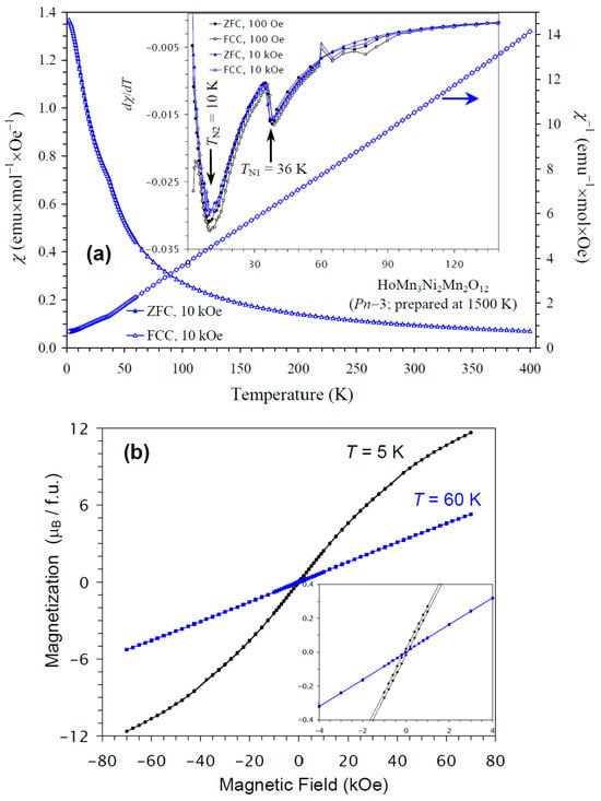 The temperature dependence of the magnetic susceptibility of HoMn3Ni2Mn2O12 is shown in Figure 7a, and Figure 7b gives M versus H curves at 5 K and 60 K. In this case, kinks on the χ versus T curves were clearly observed at 36 K. The differential /dT versus T curves at H = 100 Oe and 10 kOe showed sharp anomalies at 36 K and broader anomalies near 10 K, in agreement with the specific heat data. The M versus H curves showed almost no hysteresis. No detectable step-like hysteresis was observed near the origin at 60 K (above TN of HoMn3Ni2Mn2O12) from NiMnO3 impurity, because of its very small amount. The χ versus T and M versus H curves of HoMn3Ni2Mn2O12 were very close to those of DyMn3Ni2Mn2O12 [48]. The ground states of Ho3+ and Dy3+ cations are, of course, different [67]. Nevertheless, these cations are quite close to each other, as they have close ionic radii (rVIII(Dy3+) = 1.027 Å versus rVIII(Ho3+) = 1.015 Å [65]), effective calculated magnetic moments (10.63μB for Dy3+ versus 10.60μB for Ho3+ [67]), and maximum ordered magnetic moments (of 10μB). Therefore, it could be expected that HoMn3Ni2Mn2O12 and DyMn3Ni2Mn2O12 would have similar magnetic properties and ground states.