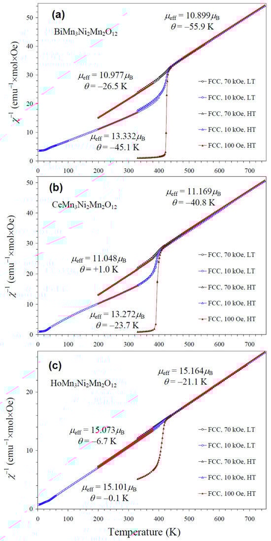 NiMnO3 is a ferrimagnetic material with a TC of about 430 K [66]. Therefore, it gives noticeable contributions to the measured magnetic properties in small magnetic fields (such as 100 Oe (Figure S2)) below 400 K (Figure 8). As NiMnO3 is a soft ferrimagnetic material, its magnetization saturates at high magnetic fields. Therefore, the larger the measurement magnetic field, the smaller the relative contribution of NiMnO3. However, we found that even at 70 kOe (the maximum available magnetic field), contributions from NiMnO3 affected parameters of the Curie–Weiss fits below 400 K (Figure 8). Therefore, we performed high-temperature magnetic measurements up to 750 K. Above about 440 K, magnetic susceptibilities were independent of the measurement magnetic field, and reliable, intrinsic Curie–Weiss parameters could be obtained. Inverse magnetic susceptibilities followed the Curie–Weiss law at high temperatures. The Curie–Weiss fits were performed between 480 and 750 K (for the 70 kOe FCC curves), and the resultant parameters are summarized in Table 3. The experimental effective magnetic moments (μeff) were very close to the calculated values (μcalc), supporting the charges of magnetic cations. In particular, the inclusion of the magnetic moment of Ce3+ [67] in the calculation gave a better agreement between μeff and μcalc; this fact gives indirect support for the +3 oxidation state of Ce, in addition to the structural data. We note that the Curie–Weiss temperatures (θ) were very small for the R = Ce and Ho samples when the fits were performed between 200 K and 380 K at 70 kOe (Figure 8).