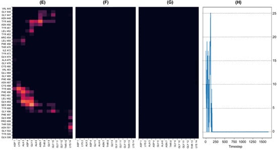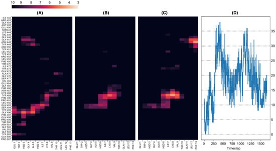Figure 5 illustrates these structural interactions, highlighting the peptide’s role in disrupting RBD-ACE2 binding. We observed some residues in the RBD with a significant interaction, including Tyr489, Phe490, Leu492, Gln493, and Glu484, which consistently interacted with residues on PEP10 (His6, Gly4, Ala5, and Ile7). These interactions suggest a stable binding interface, particularly involving some hydrogen bonding (between His6 and Gln493) and hydrophobic/aromatic contacts (between Ile7, Leu12, Phe13, and Phe490). Additional interactions were observed with RBD residues Asn487, Tyr473, and Gly447, highlighting slight shifts in binding orientation during the simulation. Notably, residues Leu12 and Phe13 on PEP10 also engaged in hydrophobic/aromatic interactions in the final frame, suggesting additional stabilizing contacts at later stages of binding.