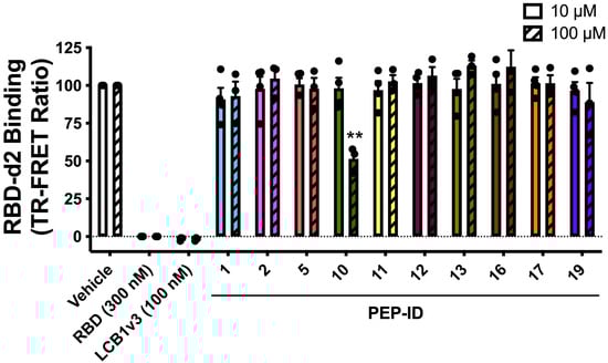 In this TR-FRET binding assay, HEK293 cells were first transfected to express the SNAP-tagged ACE2 receptor. After 48 h, the cells were labeled with the SNAP Lumi4-Tb fluorophore substrate for one hour at 4 °C. Once labeled, the cells were washed, collected, and distributed into a 384-well plate at a density of 10 µL per well. Competitors, including peptides, LCB1v3 (used as a positive control and a benchmark for inhibition), and controls, were then added to each well in 2 µL volumes at the specified final concentrations. Following this, 2 µL of the RBD-d2-labeled spike protein was added to each well, with a final concentration of 5 nM. After a 2 h incubation period at room temperature, the TR-FRET signal was read using an Envision plate reader (PerkinElmer, Waltham, MA, USA). The signal was read again after 4 h of incubation. All treatments were performed in triplicate, and the data were expressed as the TR-FRET ratio of donor-to-acceptor fluorescence. To pool the results from three independent experiments (100 µM) or four independent experiments (10 µM), the data from each experiment were normalized, with the control group (vehicle-treated) representing 100%. Statistical analysis was performed using a one-way ANOVA, with ** p < 0.001 indicating significant inhibition of binding by the tested peptides. PEP10 demonstrated significant inhibition.